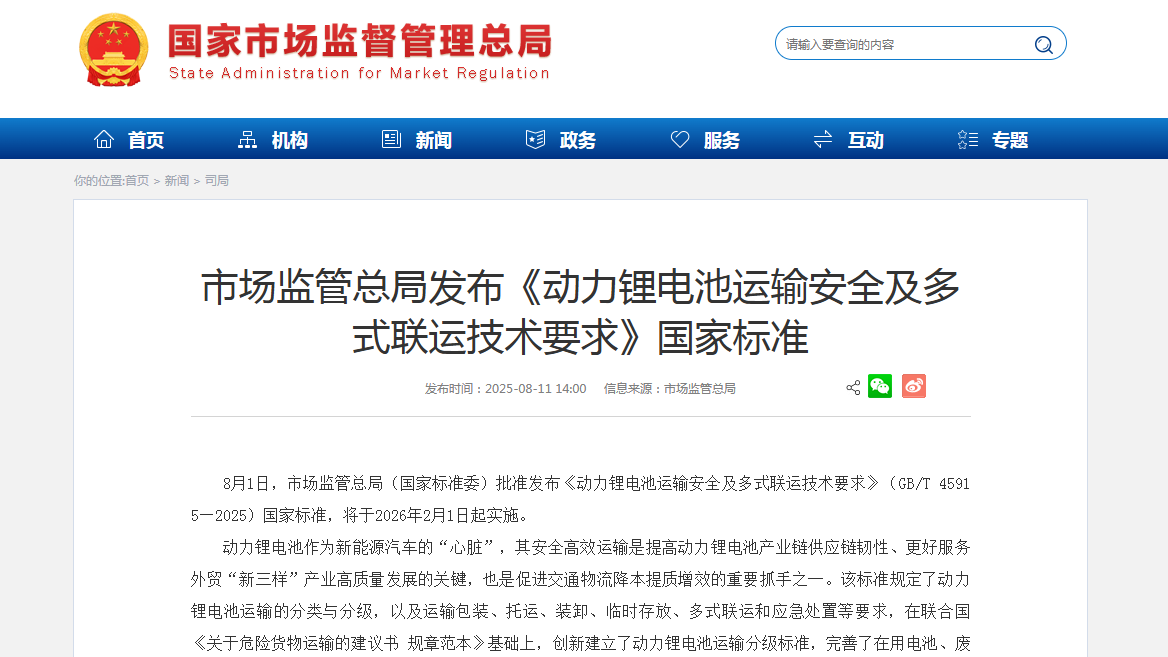 市场监管总局发布《动力锂电池运输安全及多式联运技术要求》国家标准